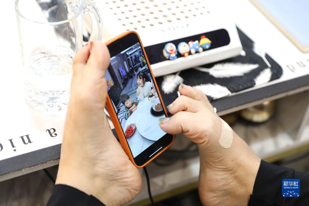 5月11日,韓丹翻看著(zhù)手機里兩個(gè)孩子的視頻。