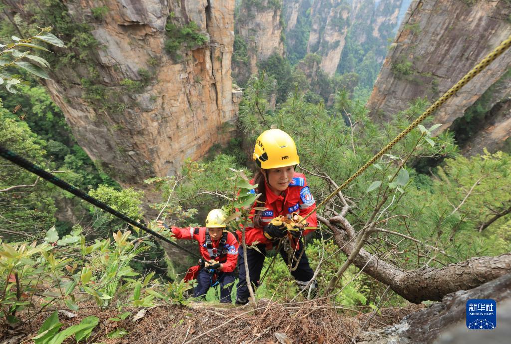 5月14日,張家界市武陵源區山地應急救援隊隊員在天子山的絕壁間索降。