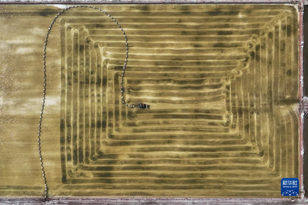 5月14日,唐山市曹妃甸區南堡鹽場(chǎng)的工人在鹽田內使用機械設備收獲春鹽(無(wú)人機照片)。