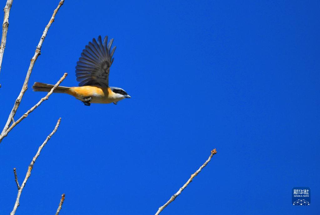 灰背伯勞在拉薩市城關(guān)區蔡公堂街道次角林村上空飛過(guò)(5月14日攝)。
