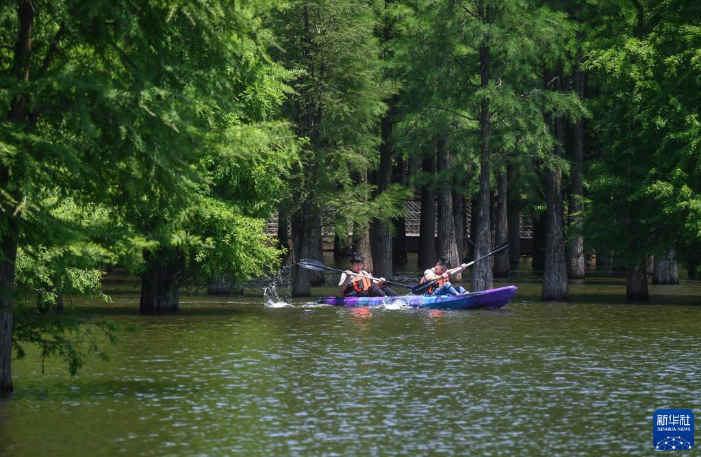 5月15日,游客劃著(zhù)皮劃艇在杭州市臨安區青山湖國家森林公園游覽。