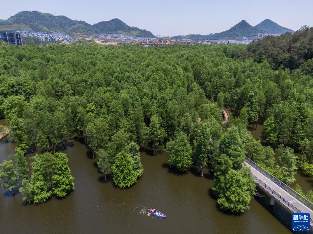 5月15日,游客劃著(zhù)皮劃艇在杭州市臨安區青山湖國家森林公園游覽(無(wú)人機照片)。