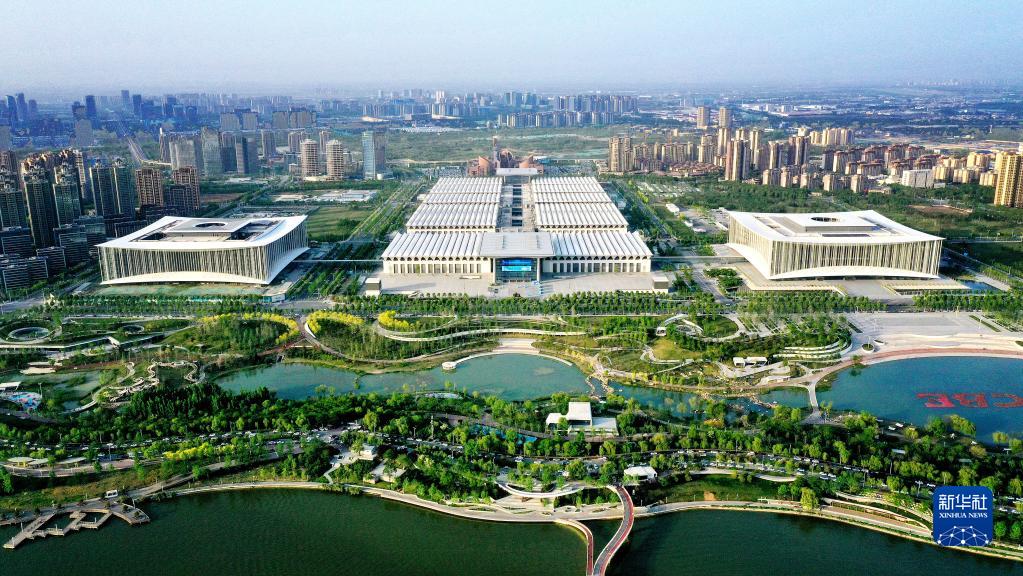 位于西安浐灞生態(tài)區的西安國際會(huì )展中心(4月16日攝,無(wú)人機照片)。