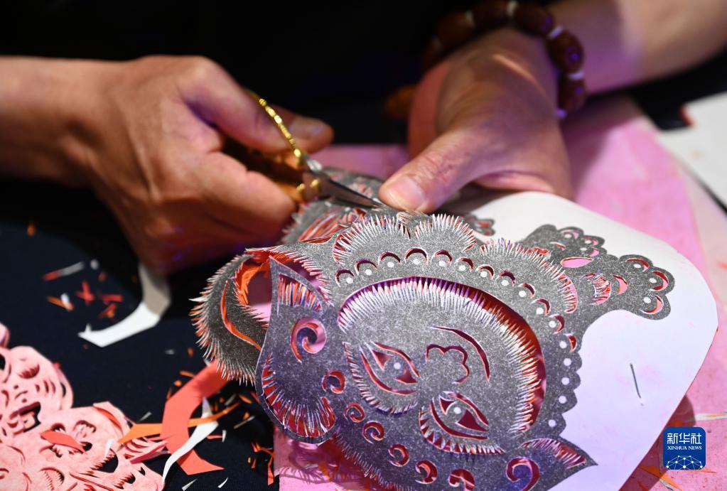 5月16日,民間藝人張林展示滿(mǎn)族手工剪紙技藝。