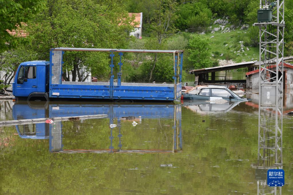 這是5月15日在克羅地亞格拉查茨拍攝的浸泡在洪水中的車(chē)輛。