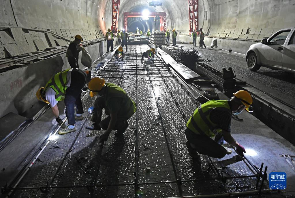 5月16日,工作人員在中鐵五局南玉鐵路6標段平悅隧道進(jìn)行無(wú)砟道床鋼筋安裝作業(yè)。