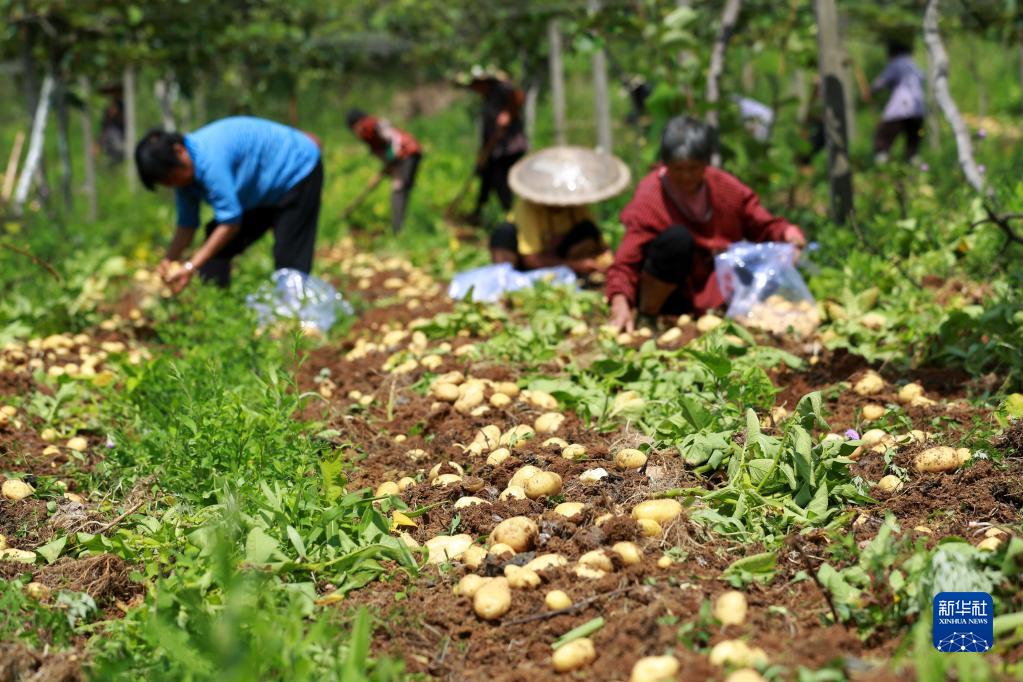 5月16日,貴州省黔南布依族苗族自治州福泉市陸坪鎮羅坳村村民在分揀土豆。近日,福泉市陸坪鎮羅坳村獼猴桃基地里套種的土豆迎來(lái)收獲季。