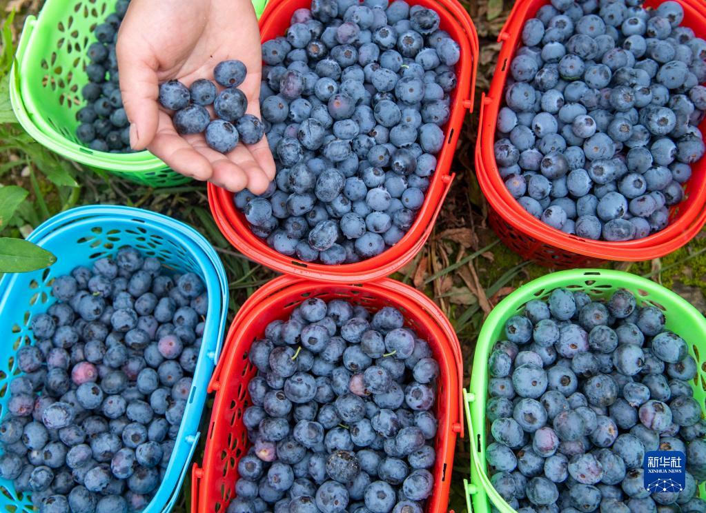 5月16日,在湖南省永州市道縣梅花鎮社灣村,村民在收獲藍莓。目前,永州市道縣果農種植的藍莓陸續成熟,開(kāi)始采摘。