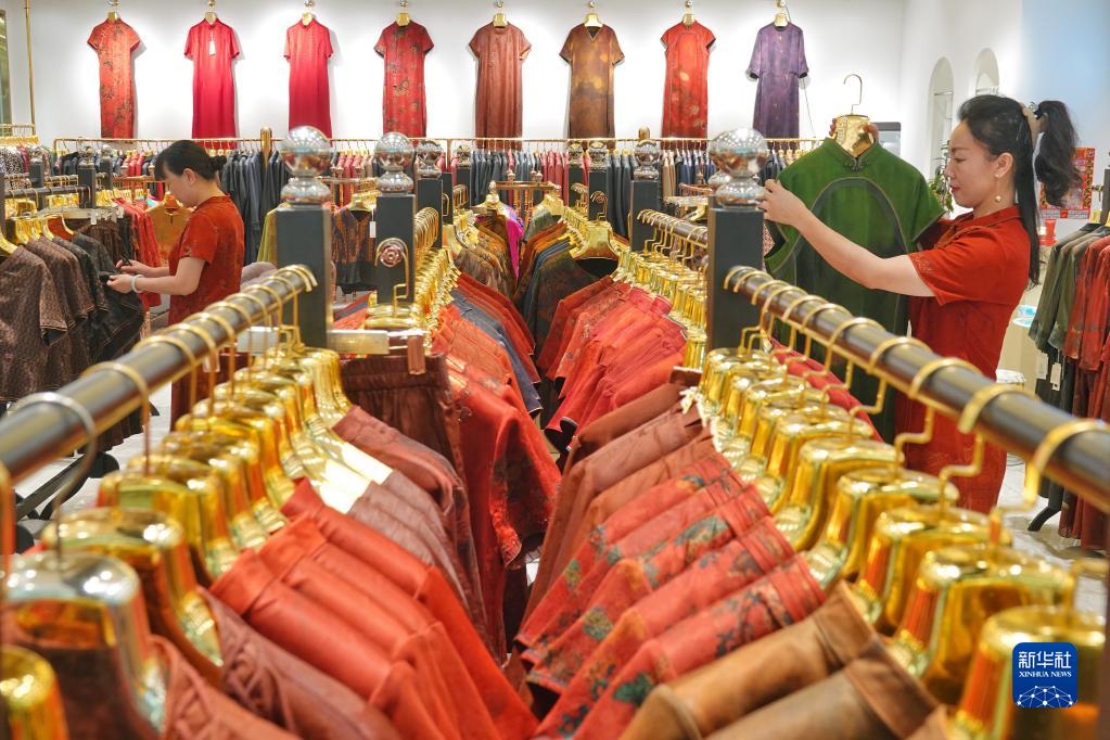 5月15日,在青島市即墨服裝批發(fā)市場(chǎng),一家旗袍專(zhuān)賣(mài)店店員在整理衣架。