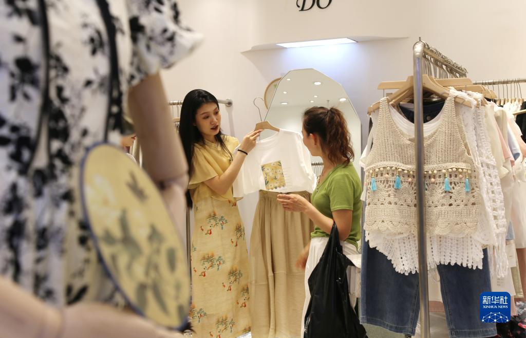 5月15日,在青島市即墨服裝批發(fā)市場(chǎng),店員(左)向顧客推薦服裝。