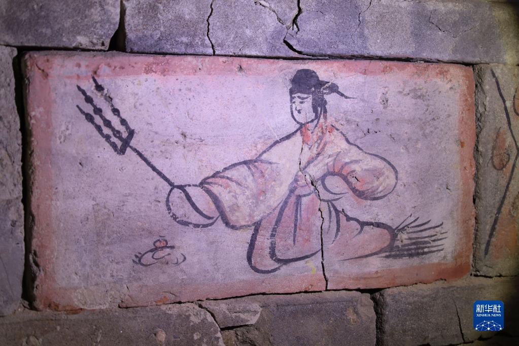 在嘉峪關(guān)魏晉墓六號墓的畫(huà)像磚上,一侍女手持三股叉串好的烤肉(5月13日攝)。