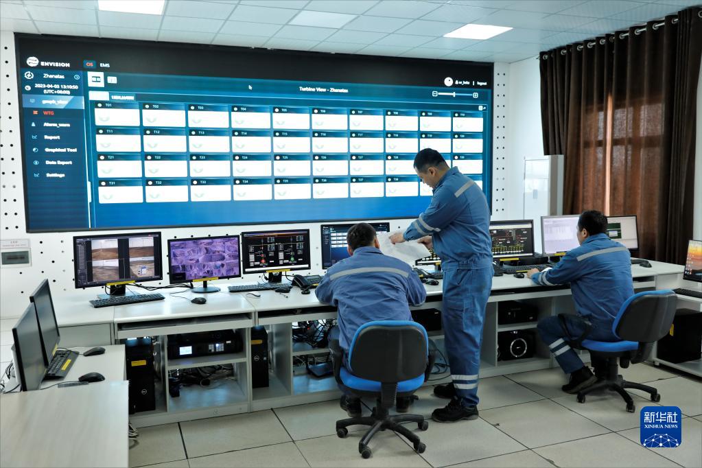 4月3日,在哈薩克斯坦札納塔斯,阿比爾加濟耶夫(中)在風(fēng)電項目中央控制室內工作。