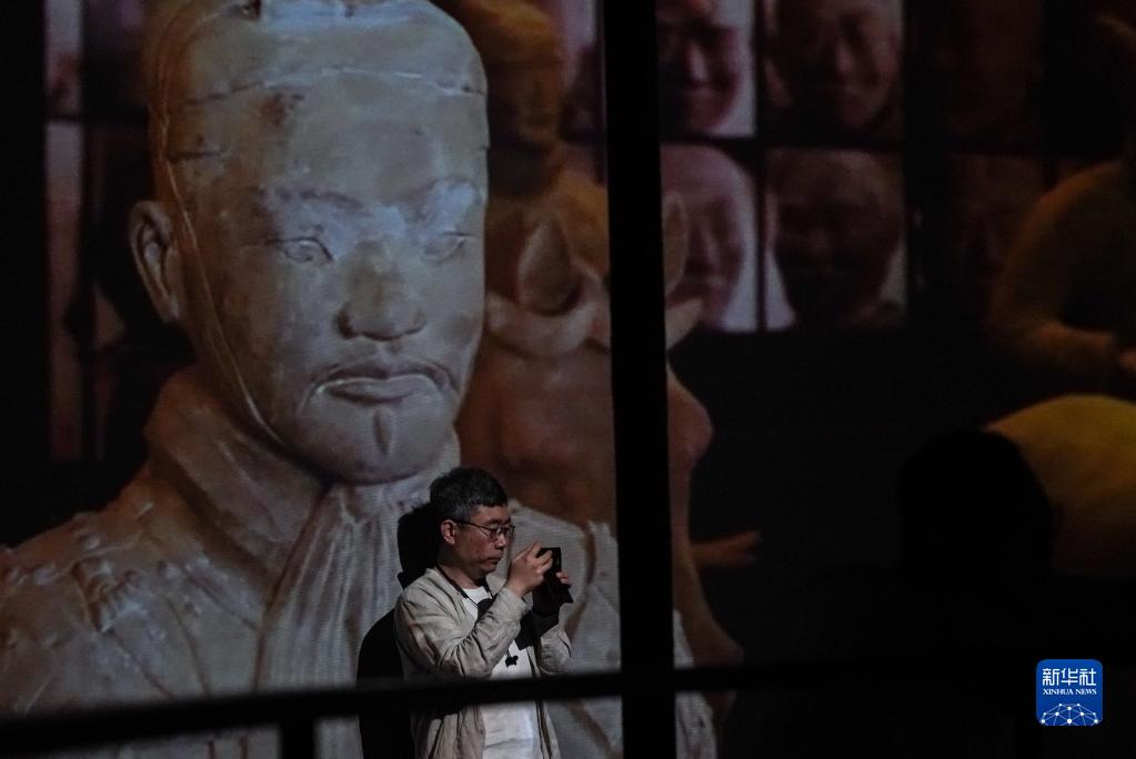 在位于北京的RE?!H創(chuàng )憶館,觀(guān)眾在沉浸式展廳拍攝兵馬俑影像(5月14日攝)。