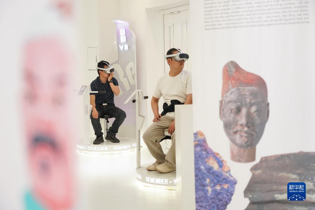 觀(guān)眾在位于北京的RE?!H創(chuàng )憶館體驗展示兵馬俑影像信息的VR設備(5月14日攝)。