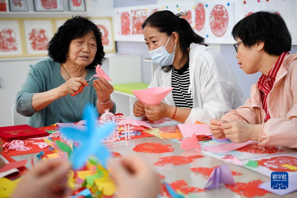 5月17日,老師(左一)向居民傳授剪紙技藝。