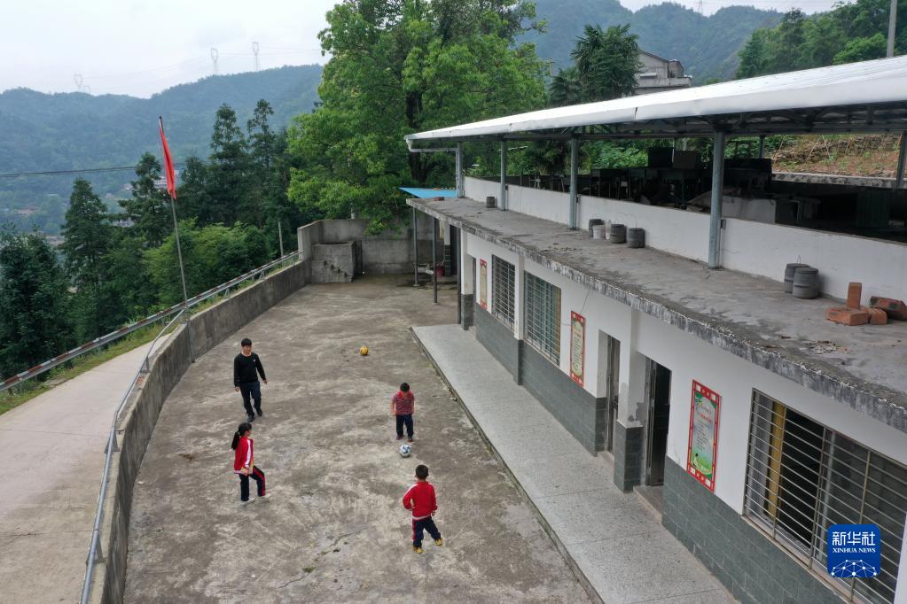 5月17日,在廣西靈川縣海洋鄉中心岐教學(xué)點(diǎn),蔡教宏和學(xué)生在課間做游戲(無(wú)人機照片)。