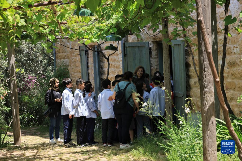 5月17日,在黎巴嫩卜蘇斯絲綢博物館,導游為當地學(xué)生講解。