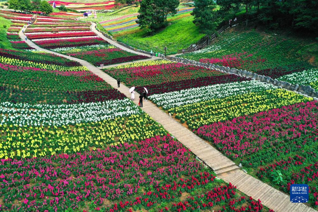 5月17日,游客在貴州省麻江縣宣威鎮藥谷江村賞花(無(wú)人機照片)。