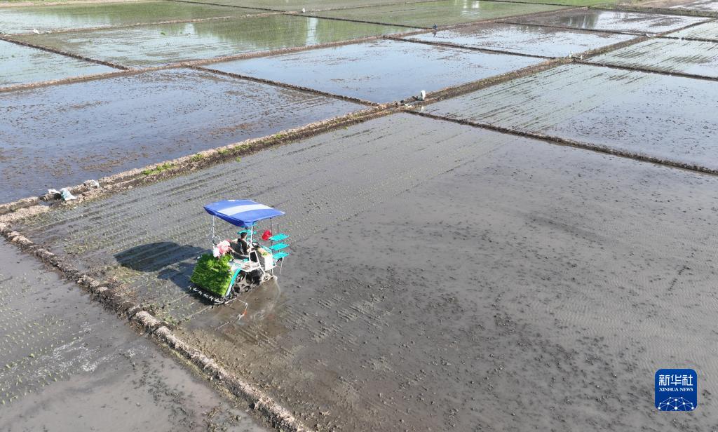 5月18日,河北唐山豐南區岔河鎮楊義口頭一村農民在水稻田使用農機插秧(無(wú)人機照片)。