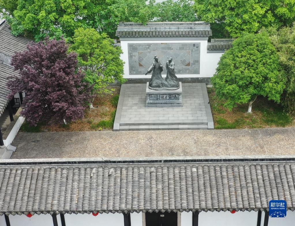 在仰圣園內拍攝的徐霞客與友人木增塑像(5月16日攝,無(wú)人機照片)。
