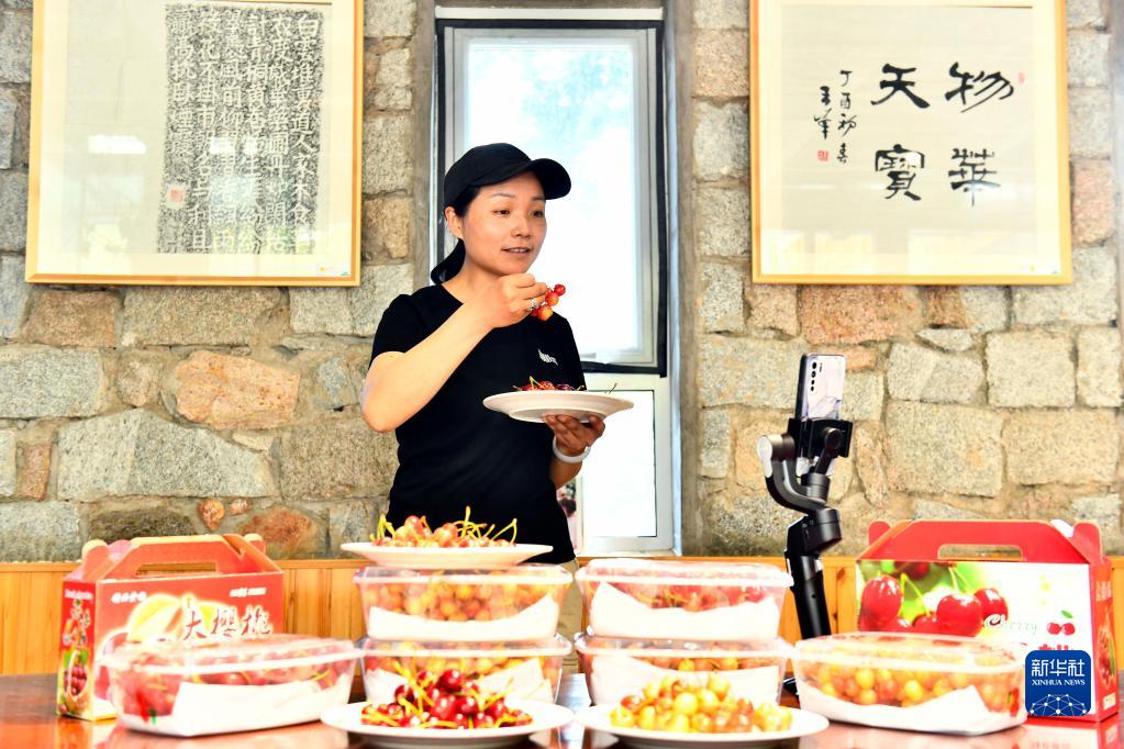 5月18日,在泰安市徂汶景區天寶鎮年家峪村,一位果農在直播推介櫻桃。