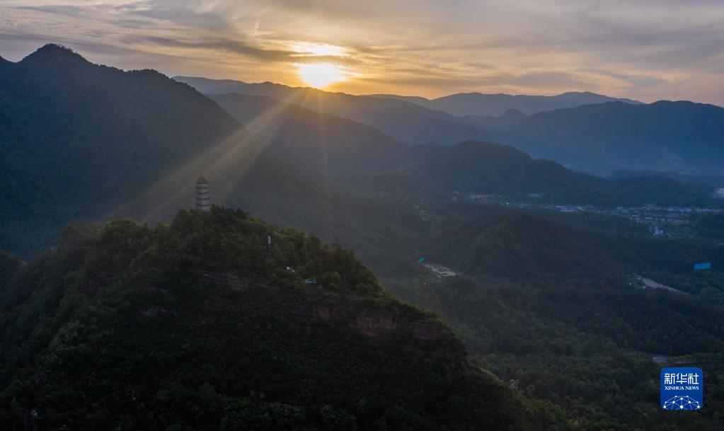 5月16日,在浙江天臺縣,清晨的陽(yáng)光照在赤城山頂的梁妃塔上(無(wú)人機照片)。