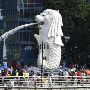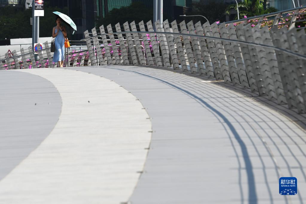 5月18日,行人在新加坡街頭用傘遮陽(yáng)。