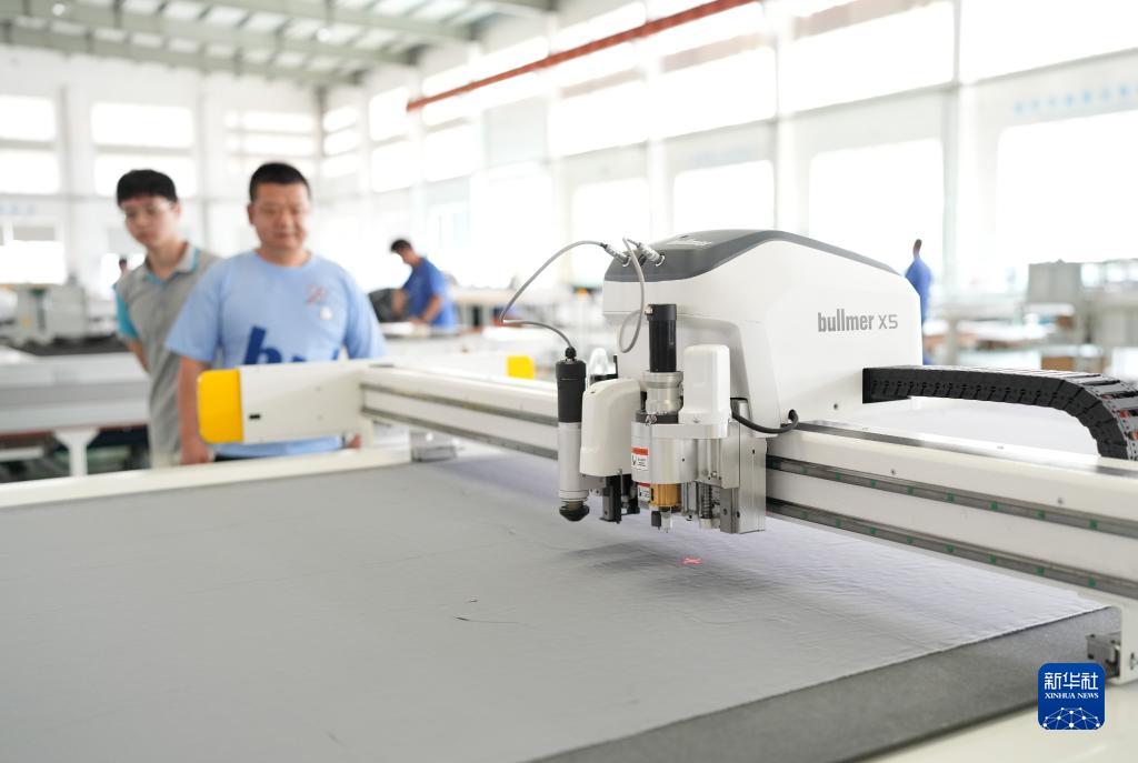5月18日,在臨海拓卡奔馬機電科技有限公司,工作人員測試一臺新款裁床。