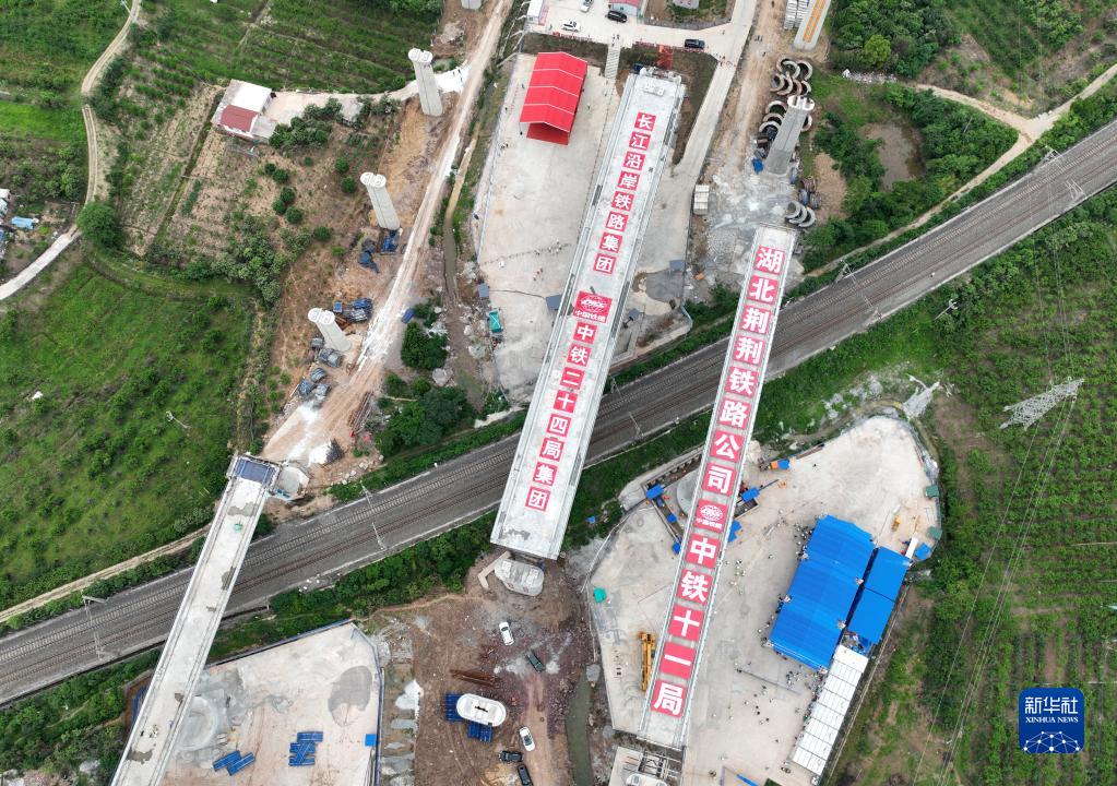 荊荊高鐵荊門(mén)特大橋與滬渝蓉高鐵太白集特大橋同步轉體后,成功跨越焦柳鐵路(5月18日攝,無(wú)人機照片)。