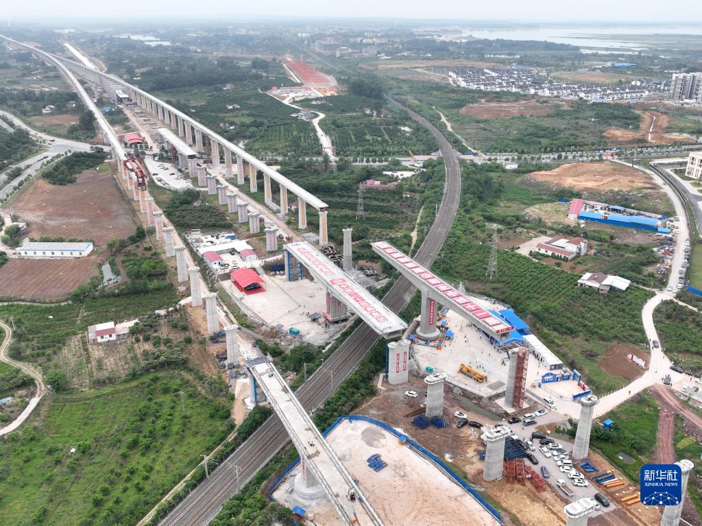 荊荊高鐵荊門(mén)特大橋與滬渝蓉高鐵太白集特大橋同步轉體后,成功跨越焦柳鐵路(5月18日攝,無(wú)人機照片)。