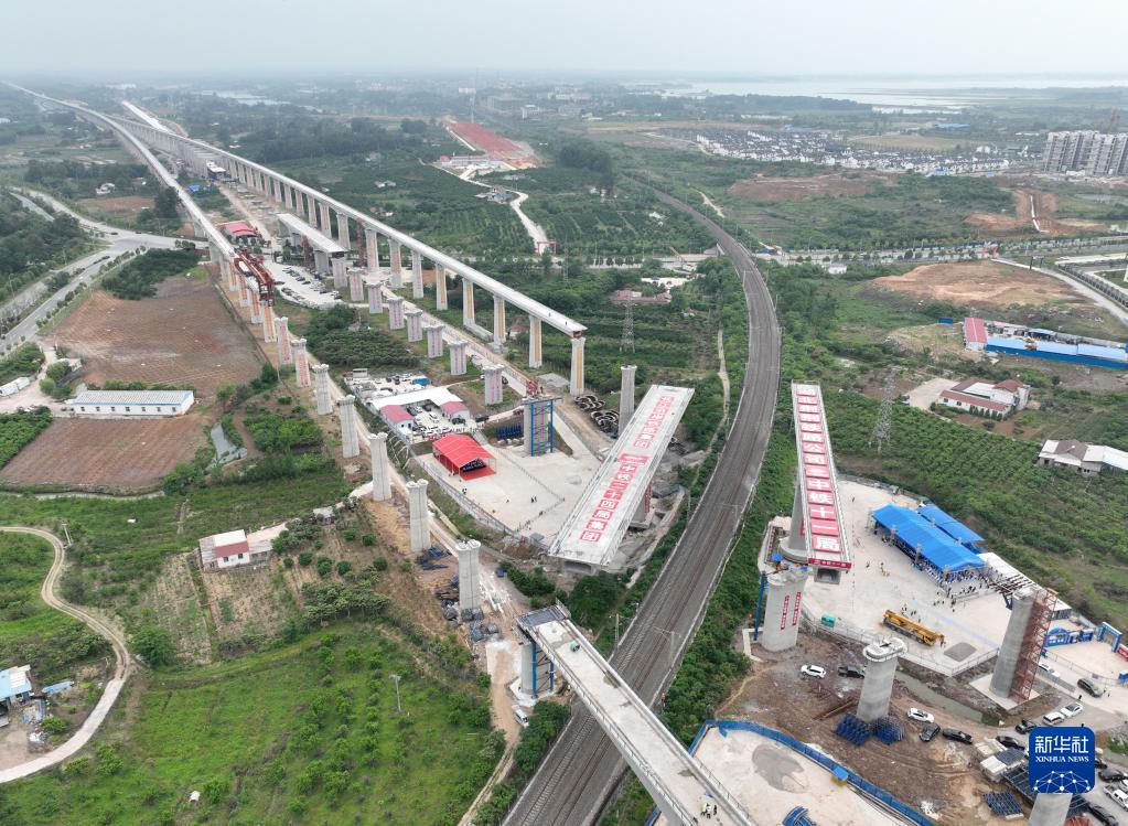 荊荊高鐵荊門(mén)特大橋與滬渝蓉高鐵太白集特大橋轉體前(5月18日攝,無(wú)人機照片)。