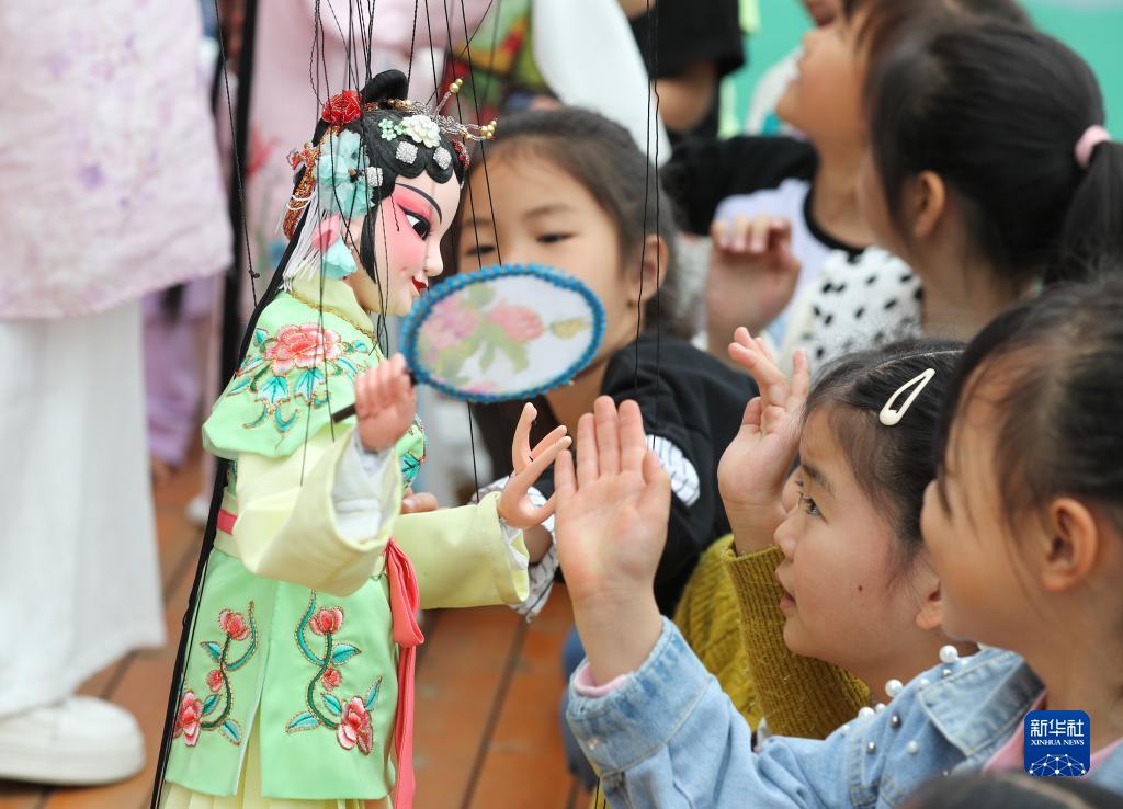 在七都幼兒園,小朋友與提線(xiàn)木偶互動(dòng)(4月20日攝)。