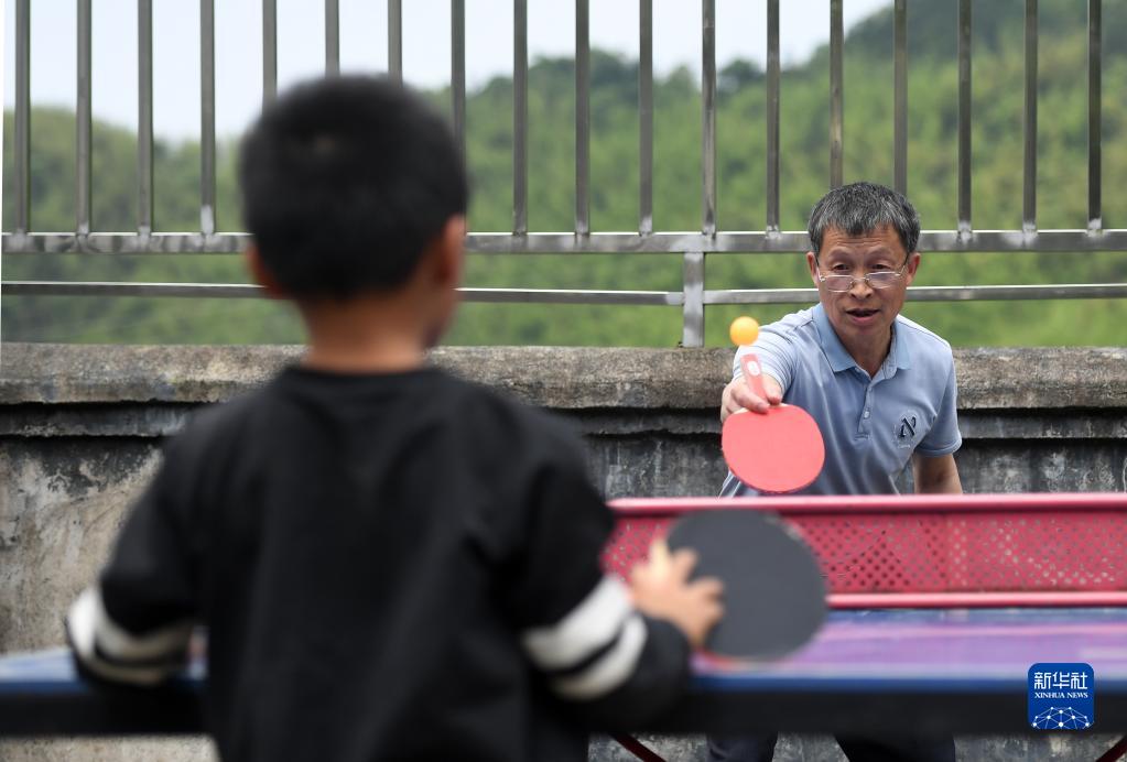 5月18日,在廣西靈川縣蘭田瑤族鄉深潭教學(xué)點(diǎn),趙洪老師和學(xué)生打乒乓球。