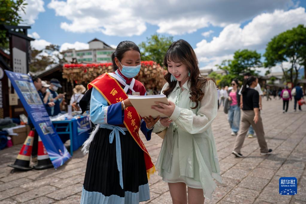 5月18日,一名志愿者(左)在麗江古城向一名游客進(jìn)行問(wèn)卷調查。