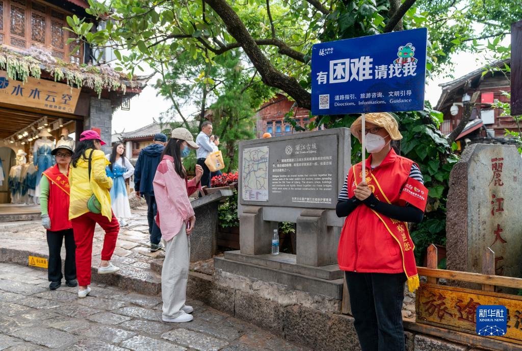 5月18日,一名志愿者(右)在麗江古城一處志愿服務(wù)點(diǎn)值守。