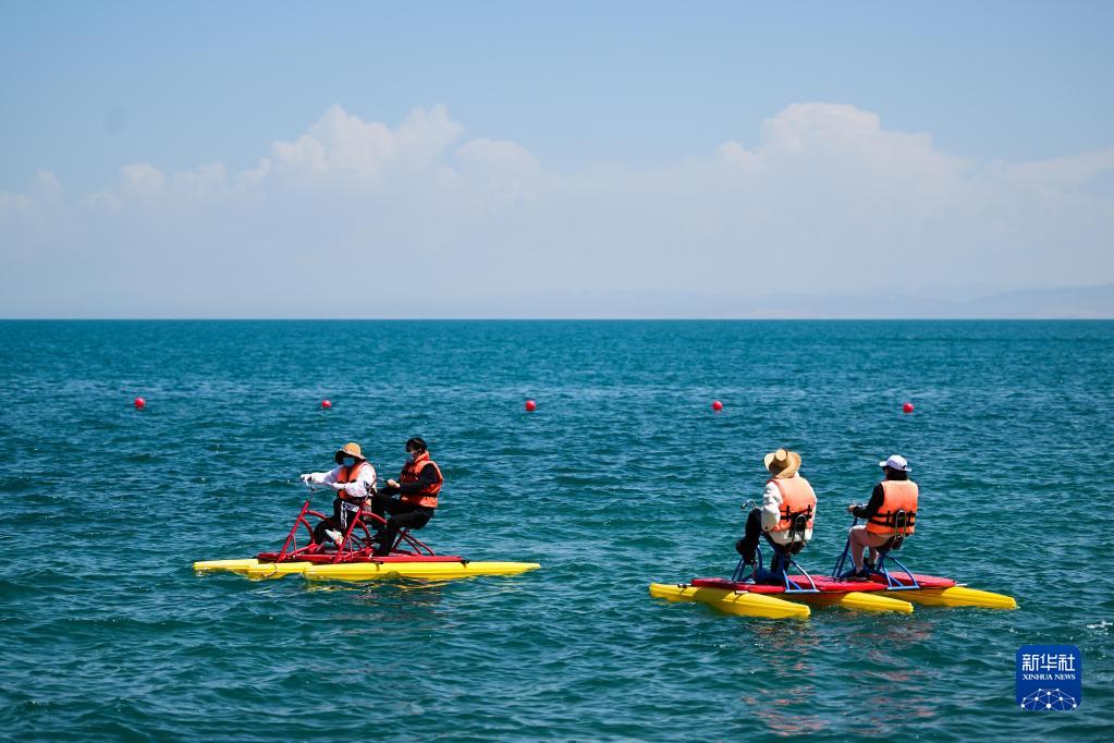 5月18日,在青海湖二郎劍景區,游客在體驗水上游樂(lè )項目。