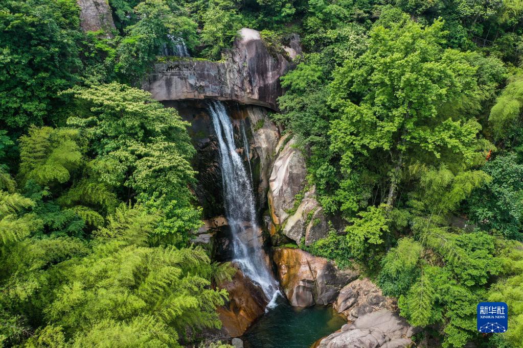 5月16日在浙江省臺州市天臺縣天臺山風(fēng)景旅游區拍攝的石梁飛瀑一景(無(wú)人機照片)。石梁飛瀑景點(diǎn)有一條巨大石梁橫跨在兩崖之間,瀑布水流從梁底穿過(guò),墜入幽谷之中。徐霞客在游記中寫(xiě)道:“下瞰深潭,毛骨俱悚?!?/p>