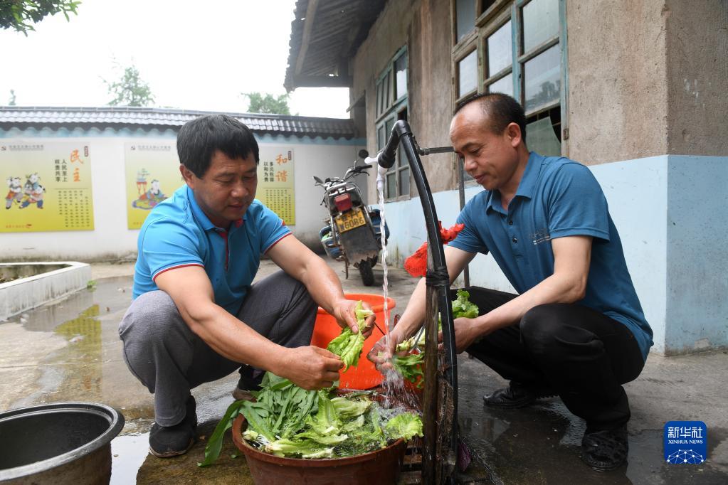 5月19日,在廣西靈川縣大境瑤族鄉金竹教學(xué)點(diǎn),秦振林(左)和李忠華在洗菜準備做午飯。