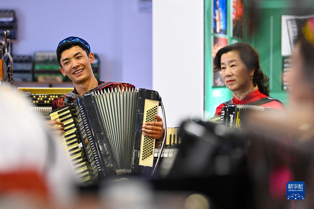 在伊寧市六星街,多民族手風(fēng)琴樂(lè )隊在為游客演出(5月19日攝)。