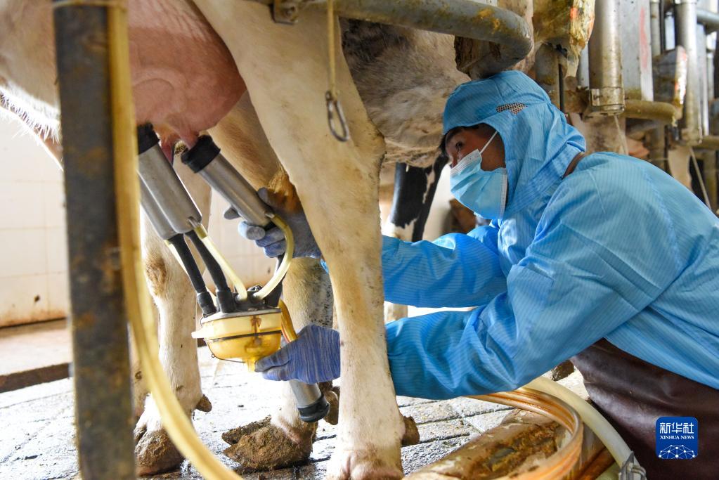 在新疆伊寧市巴彥岱鎮奶牛養殖場(chǎng),工人使用自動(dòng)擠奶設備擠牛奶(5月19日攝)。