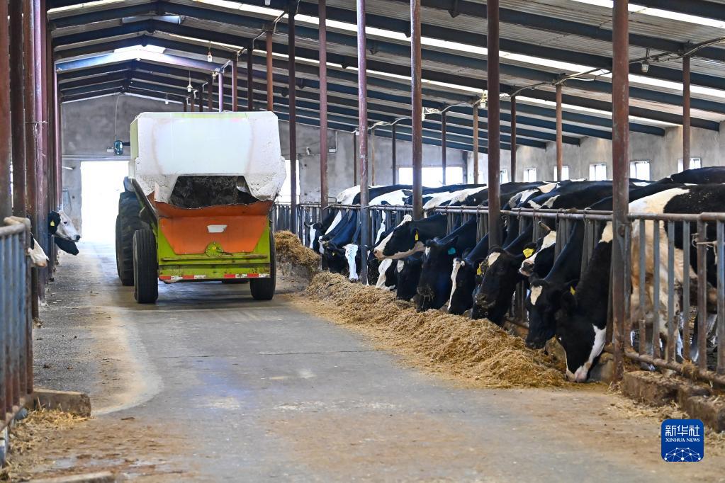 在新疆伊寧市巴彥岱鎮奶牛養殖場(chǎng),工人駕駛自動(dòng)撒料車(chē)喂牛(5月19日攝)。
