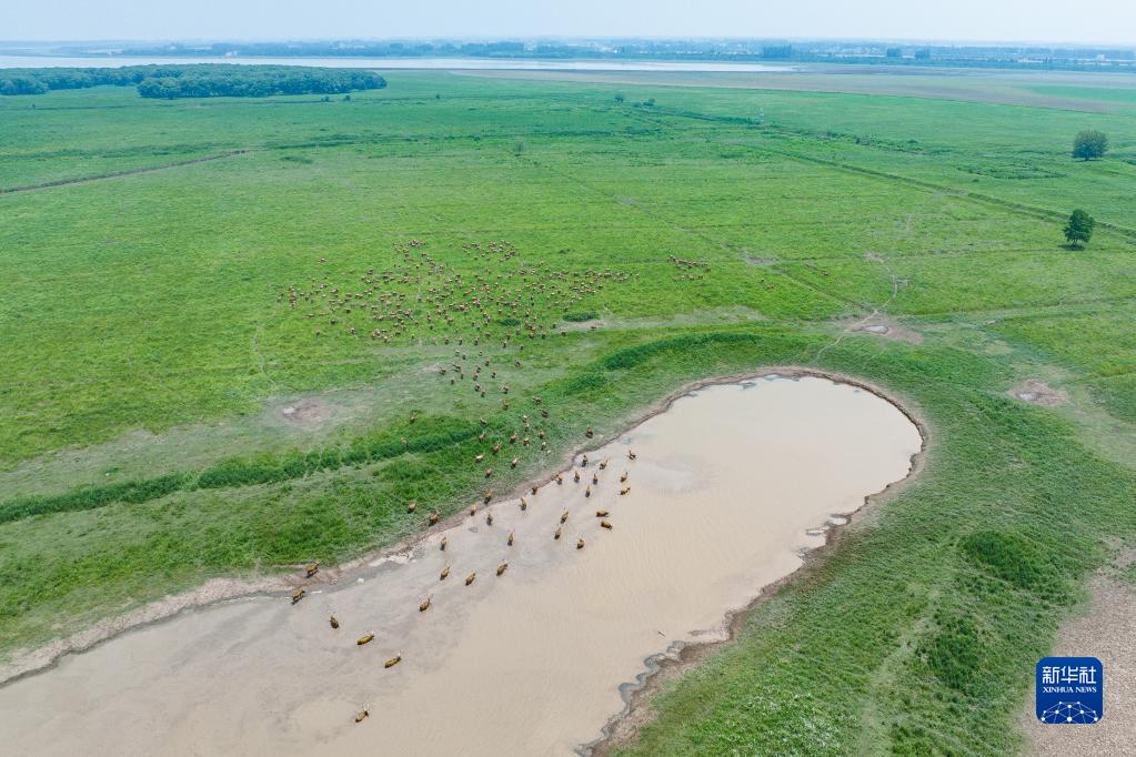 5月19日,一群麋鹿在湖北石首麋鹿國家級自然保護區內活動(dòng)(無(wú)人機照片)。