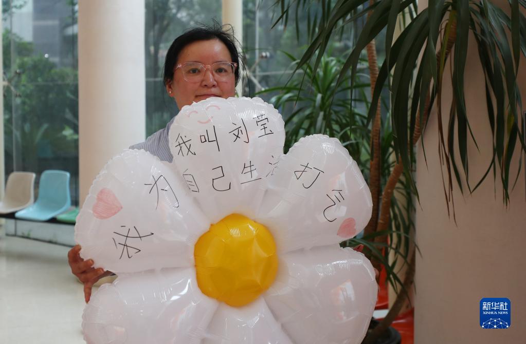 在上海虹口區青少年活動(dòng)中心,劉瑩完成了一場(chǎng)活動(dòng)的氣球拱門(mén)搭建工作后,在一個(gè)花形氣球上寫(xiě)下了自己想說(shuō)的話(huà)(5月18日攝)。