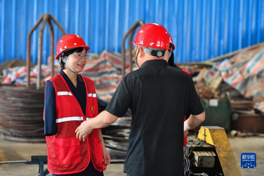 在湘潭市岳塘區一個(gè)殘疾人集中就業(yè)示范基地,扶婷(左)和法律志愿服務(wù)團成員為企業(yè)提供免費法律咨詢(xún)服務(wù)(5月18日攝)。