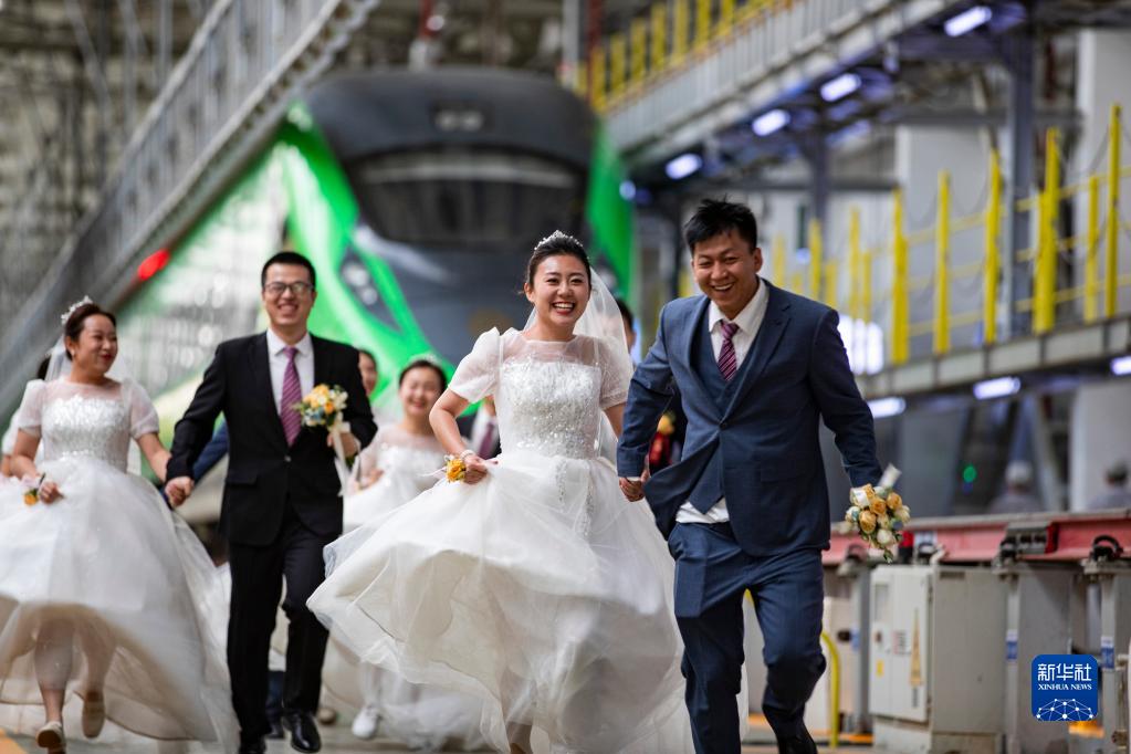 5月20日,新人們以休整中的動(dòng)車(chē)組列車(chē)為背景拍攝婚紗照。