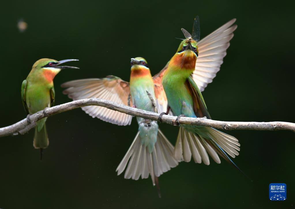 5月20日,兩只栗喉蜂虎在等待雄鳥(niǎo)(右)喂飼昆蟲(chóng)。
