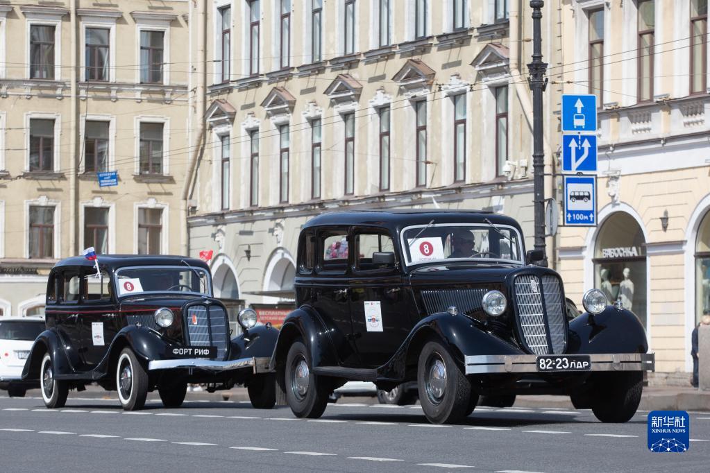 5月20日,老爺車(chē)在俄羅斯圣彼得堡街頭巡游。