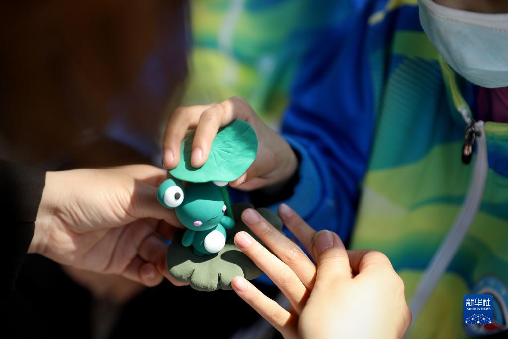 5月18日,手工美術(shù)課上,莊巖握著(zhù)一名同學(xué)的手,讓他感受手工成品的樣子和細節。