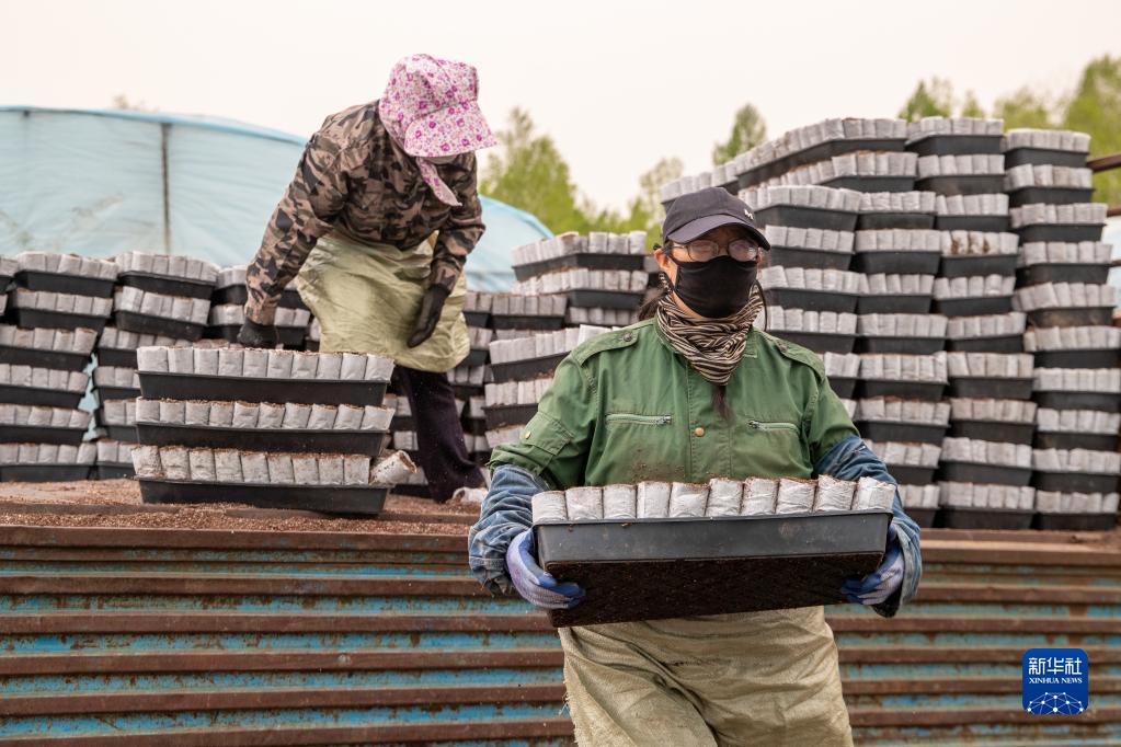 5月20日,在伊春森工集團紅松種苗繁育基地,工作人員在搬運輕基質(zhì)容器。