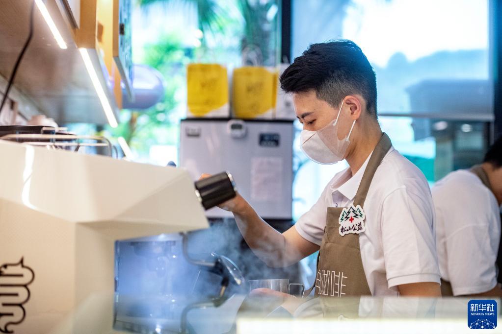 5月5日,在位于重慶市渝北區松山醫院內的一角咖啡廳內,張凌云為顧客制作咖啡。
